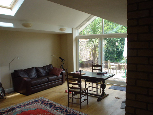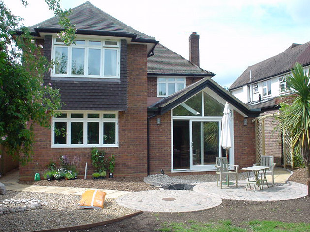 Large rear extension to provide additional master bedroom and dining room plus new kitchen, utility room and family bathroom. The design resolves the awkward angled plan form of the original house and provides a vaulted dining area with a large glazed screen for a view of the landscaped rear garden.